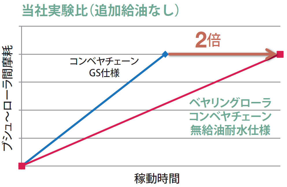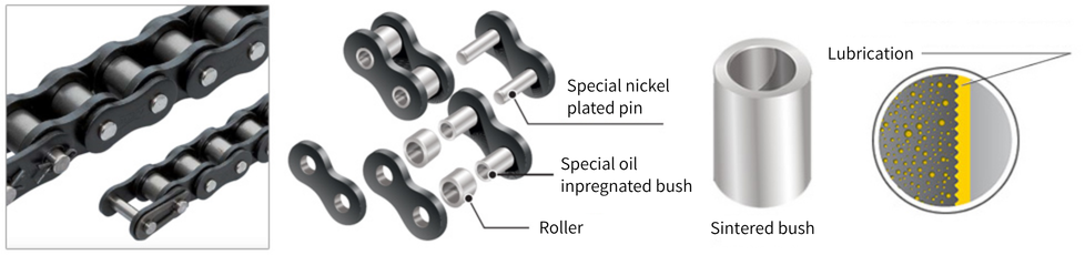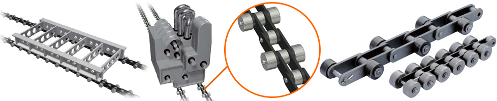 免加油鏈條被廣泛用於減少輸送鏈所需的維護工作。將側側邊滾子子鍊和頂滾子鏈的側邊滾子滾子和頂滾子軸承更換為 Lambda 規格,也有助於降低滾輪旋轉產生的雜訊。