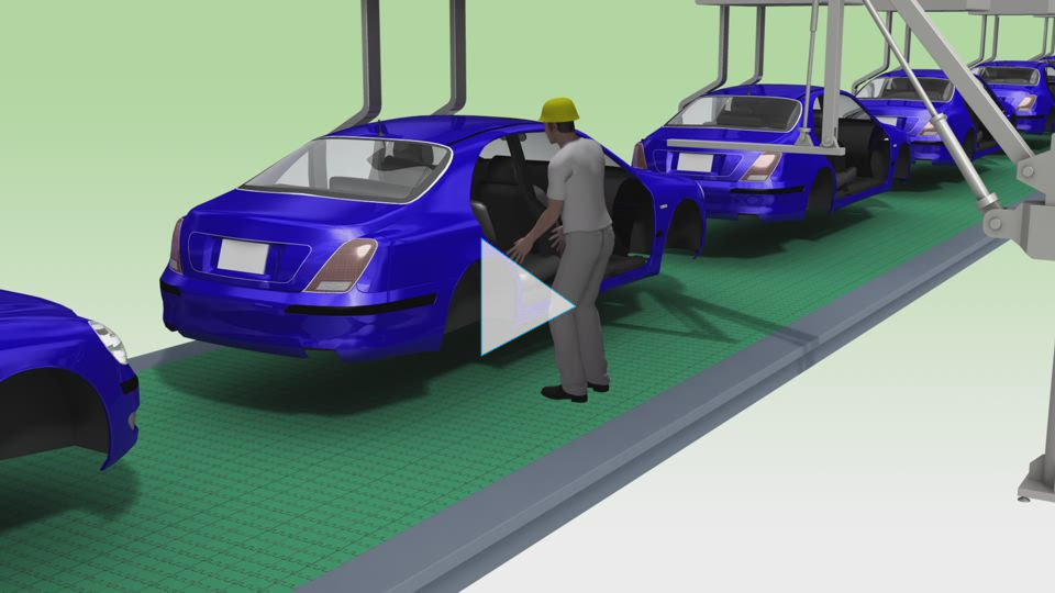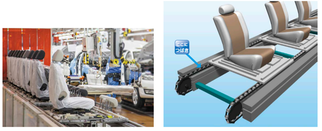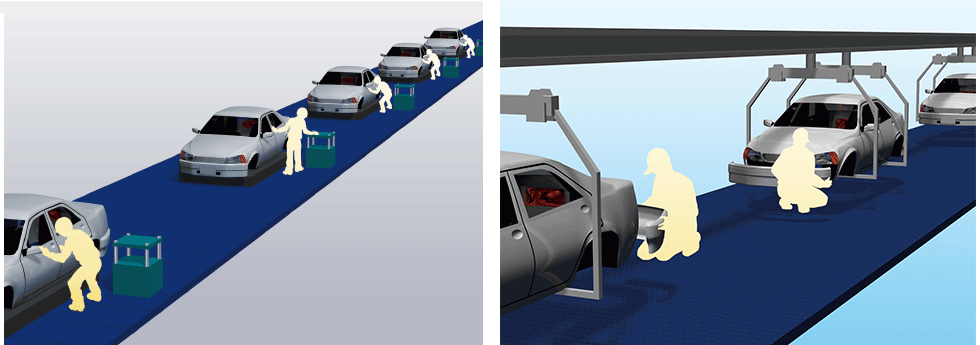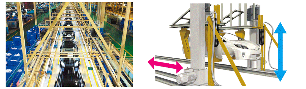 在零件的加工、裝配線中,裝載在吊起的零件和臺車上的發動機的傳送帶和搬運作業人員和工具臺車的傳送帶同步運轉,以提高作業效率。