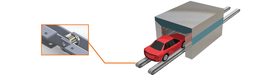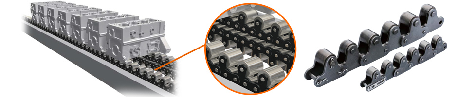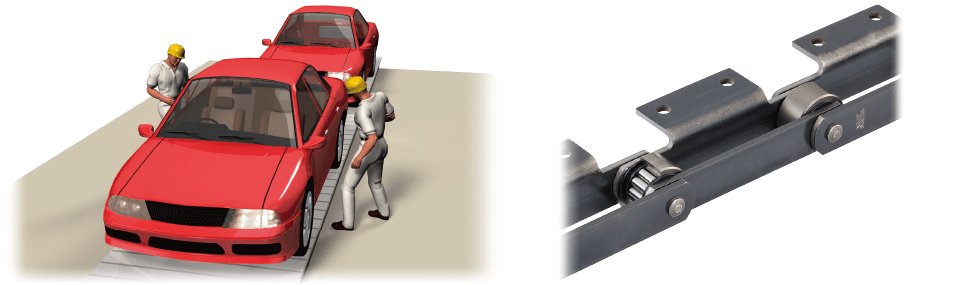 堆積倍速鏈條/鋼輥系列用於輸送車身運輸托盤。此外,採用薄型框架,可製造結構緊湊的輸送機。