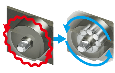 此鏈條採用獨特的結構,在滾輪內部使用圓筒滾柱,不僅可以抑制黏滑現象,而且實現了高效率、降低成本,延長了滾輪和導軌的使用壽命。