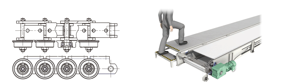 在傳統的輸送鏈中,有必要挖掘凹坑並安裝輸送帶,但是通過使鏈條短間距,可以實現低地板輸送帶,並且在不挖掘凹坑的情況下將輸送帶安裝在地板上通過這樣做,我們縮短了安裝工期。