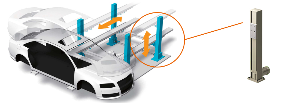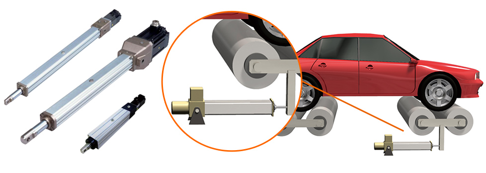 電動電動缸用於將裝載的車輛固定在工作台上。它們可以降低能耗,並且可以安裝在推車上有限的空間。
