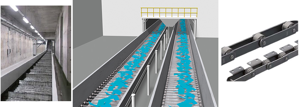此同步作業採用塑膠模組鏈條式人員輸送機。鏈條寬度可選,並可安裝低底盤人員輸送機以縮短安裝週期。