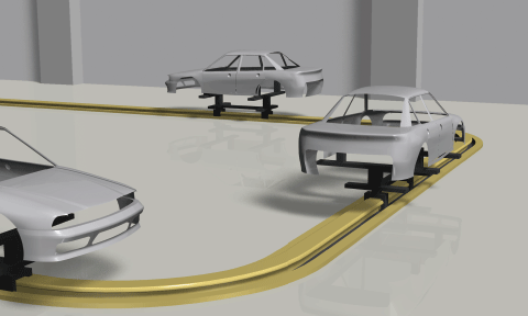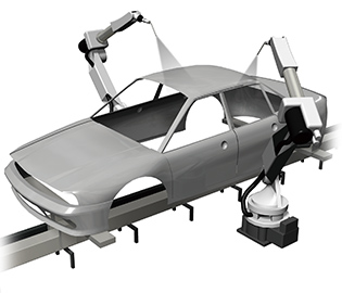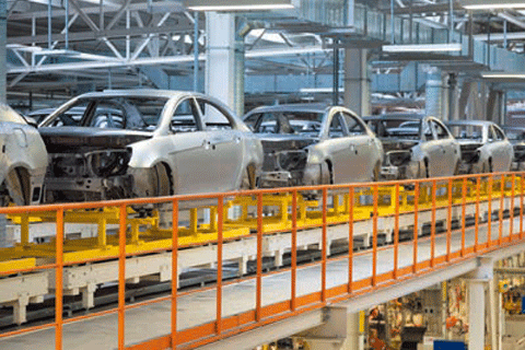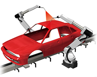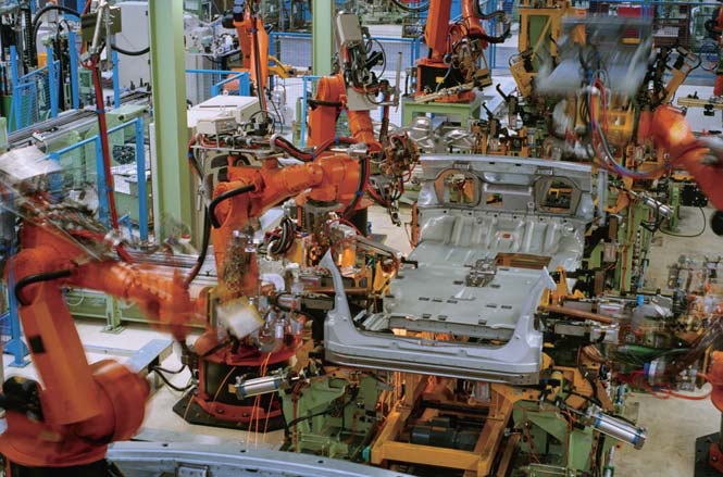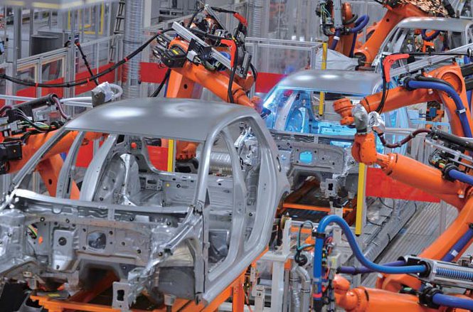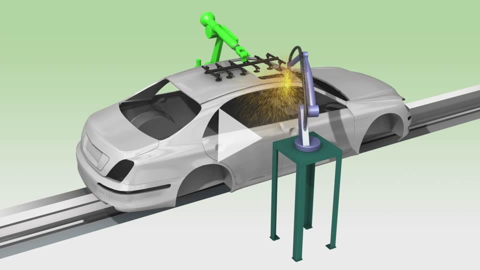 通過許多多軸機械人將衝壓過程中完成的部件組裝到車身的過程。很多焊接作業都是機器自動化的。