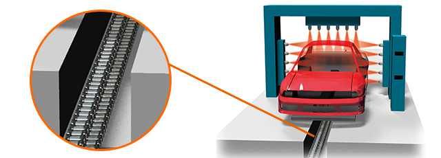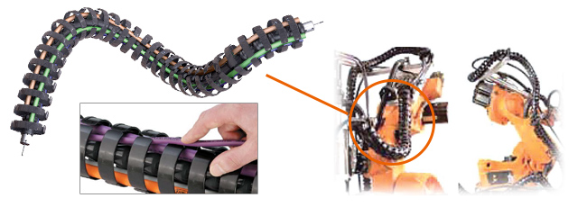 機器人也被引入車輛偵測流程,而三維移動式電纜保護鏈條ROBOTRAX 則應用於這些機器手臂上。 ROBOTRAX 是電纜保護鏈條,電纜只需插入連接件側面的縫隙即可,從而簡化了維護工作。