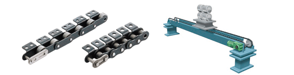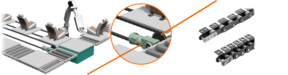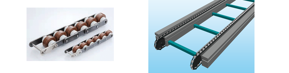 在將板材和其他材料裝載到托盤上並輸送到裝配線的設備中,由於堆積較大,因此通常採用倍速鏈條和鋼製滾輪系列。即使裝載重物的托盤也能運輸,並且能夠減少托盤的損壞。對於輕型物品堆積較多的托盤運輸塑膠滾子系列。
