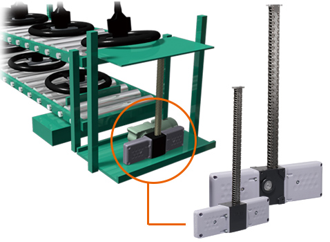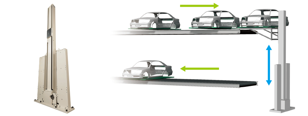 電動升降機(Lift Master)在拾取裝載在托盤上的零件(例如後門)後,會用於將空托盤升降到下方回收輸送機的設備中。它可以單側升降,並且可以安裝在狹小的空間內,從而有效利用空間。