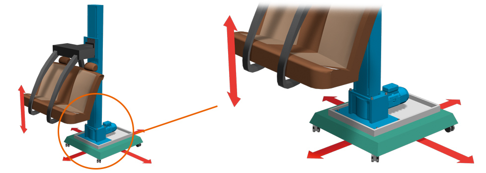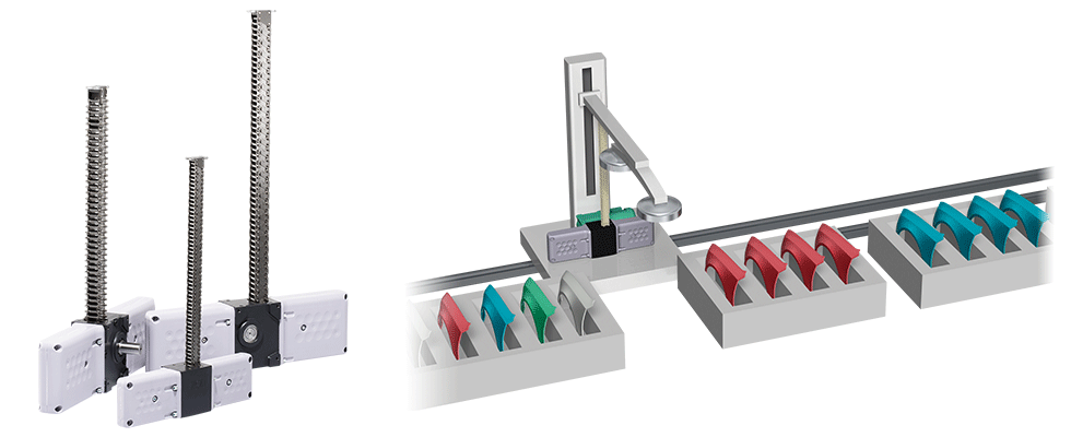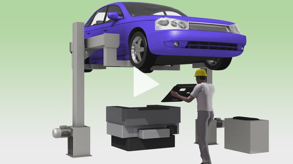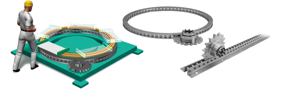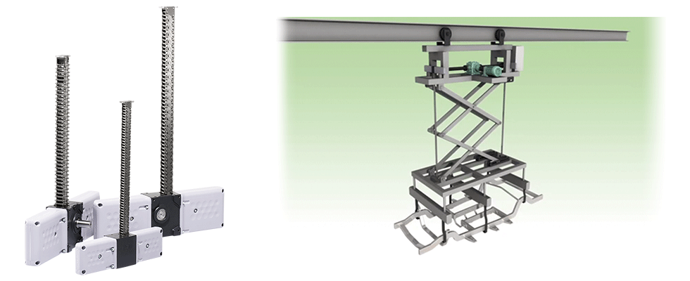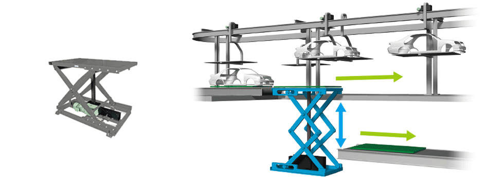 在用於旋轉重型部件(例如後懸吊)並在傳送帶之間轉移這些部件的設備中,會使用一個結合了電動升降機(Lift Master)和銷齒輪傳動組件的模組。將可放置和放下的電動升降機(Lift Master)安裝在採用銷齒輪傳動組件的旋轉板上,可以在狹小的空間內實現平穩的旋轉和轉移。