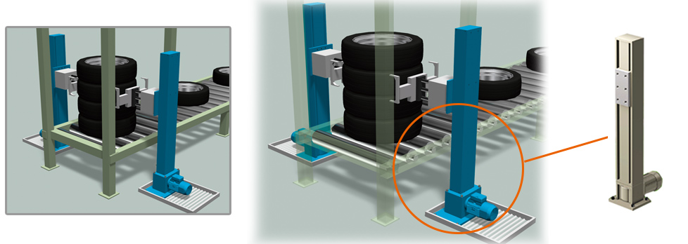 在將四條一組堆放在一起的輪胎運送到裝配線之前,需要使用一種設備將它們逐個分開並拆垛。這種設備使用電動升降機(Lift Master),兩側各有兩個升降裝置。