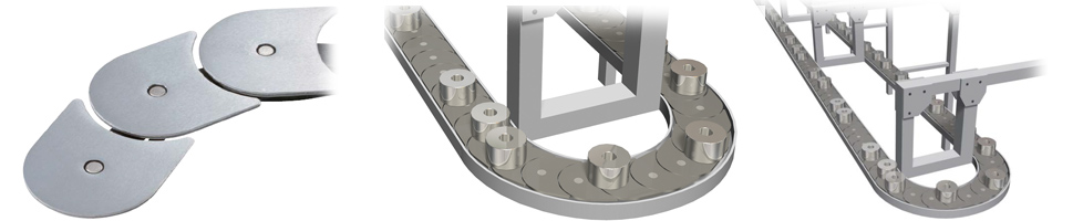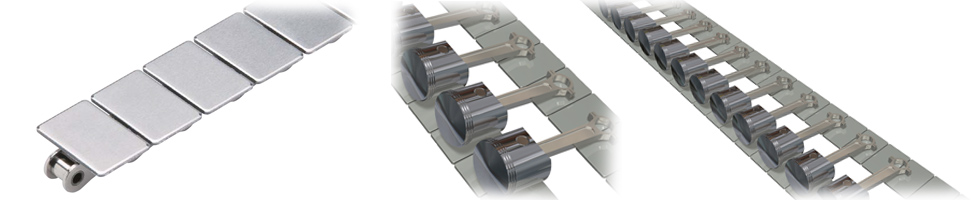 這是一種由連接在雙節距鏈條上的鍊板組成的輸送鏈。有多種規格可供選擇,例如耐磨性增強的硬化鍊板,以及表面鍍硬鉻並經過拋光處理的鍊板,因此您可以根據工件和使用環境選擇最合適的鏈條。