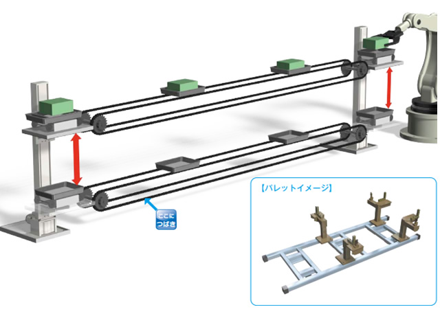 長皮帶用作工位間台車運作的驅動系統(適用於不會發生飛濺的製程)。齒形皮帶可實現可靠的嚙合驅動,確保台車平穩運作。此外,採用超高強度HY規格皮帶,可減少皮帶寬度,從而實現緊湊的設備設計。