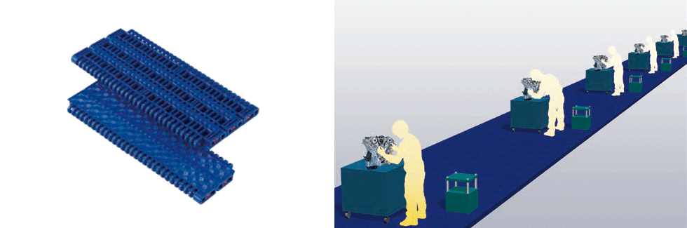 在接收場,用於將裝載在推車上的汽車零件運入和運出工廠的設備中使用了採用塑膠模組鏈條輸送機。這種低底板、落料泵送式輸送機無需挖坑即可安裝,因此可以在短時間內進行設備升級。