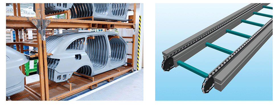 在向焊接工藝供應材料的過程中,可以配置一個滑橇/托盤循環系統,該系統結合了使用電動升降機(Lift Master)升降機構和使用倍速鏈條輸送機。
