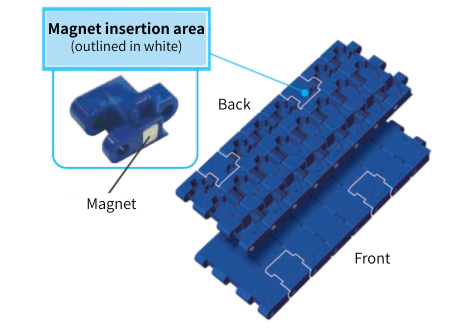 在將黃油等食用油塗在托盤或產品上的過程中,油可能會粘在鏈條上,托盤可能會滑動並導衹運輸故障。因此,採用了帶磁鐵的BTM8H-M型,可確保搬運。