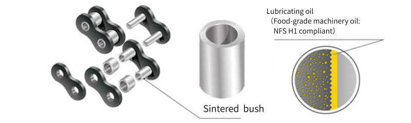 椿的免加油連鎖免加油鏈條特殊含油套筒免加油版。 它不會讓油黏在產品上,衛生且使用壽命長。特殊含油套筒潤滑劑符合NSF H1標準,因此也可用於食品機械。