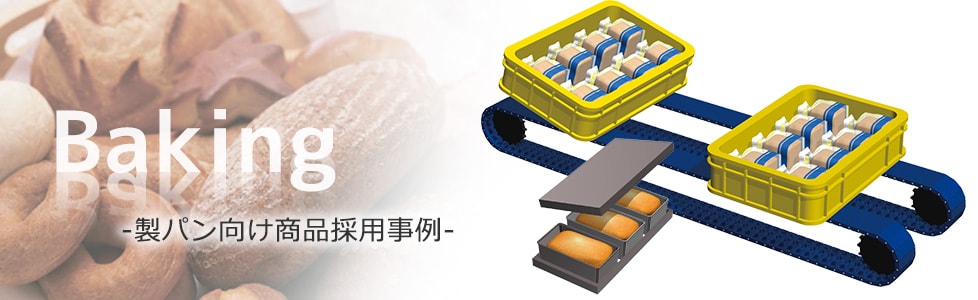 椿本的產品,包括塑膠頂板鏈條在麵包店的各種輸送應用中展現了其真正的價值,例如輸送食品模具和金屬托盤,以及使用傾斜輸送機。