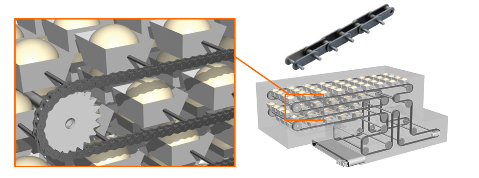 為了運送各種尺寸的模具,椿本公司採用了大型輸送鏈條,這種輸送鏈可以客製化間距和附件。