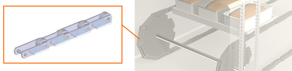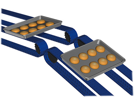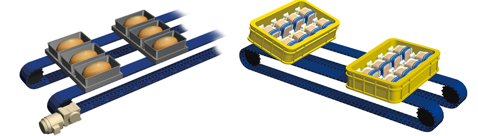 在麵包工廠中,金屬托盤透過傾斜式輸送機進行運輸,並用於諸如塗抹食用油等工序。為了確保在各種運輸條件下都能可靠地進行運輸,工廠採用了BTM8H-M型號,該型號的塑膠頂板鏈條中嵌入了磁鐵。