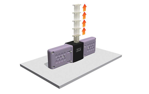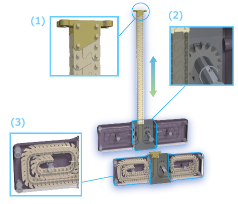 Zip Chain是一種由兩條鏈條像拉鍊一樣相互咬合而成的鏈條,形成一個堅固的單柱,從而實現長行程「推拉」運動。椿咬合式鏈條傳動裝置就是一款利用這種鏈條進行直線作動機的產品。