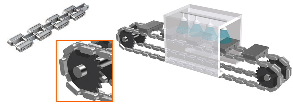 雙節距鏈條用於升降托盤架,各種MD齒輪箱用於驅動它們。