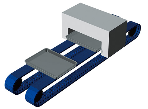 椿本塑膠頂板鏈條用於食品容器和金屬托盤的輸送過程中。與金屬鏈不同,使用塑膠頂板鏈條可降低因金屬接觸而導致異物污染的風險,從而確保食品安全。