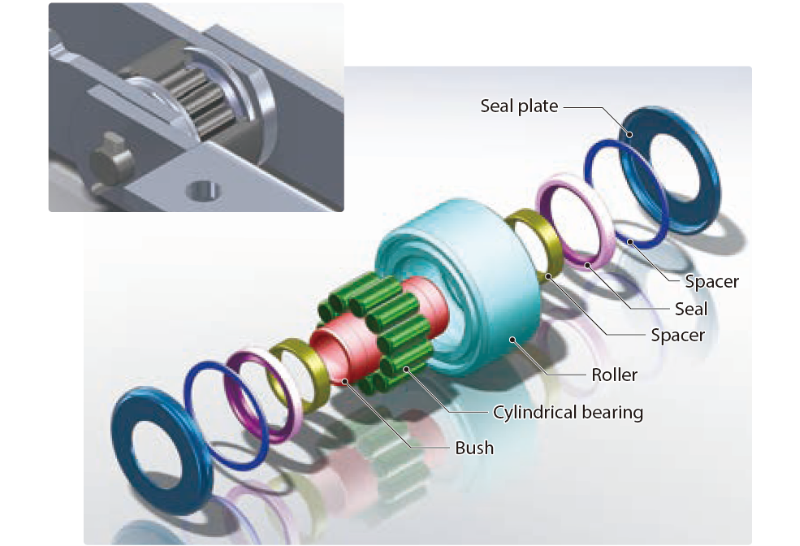 如果極易磨損的灰塵或材料進入襯套和輥之間以及外側輥,則會妨礙輥的旋轉,從而加速襯套和輥之間的磨損。結果,鏈條在早期達到磨損極限。通過使用防塵規格軸承滾子,可大幅延長回收鏈條的壽命。