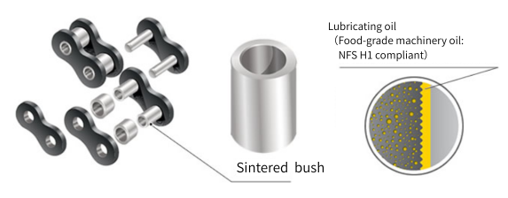 ラムダチェーンKF仕様は、常温から高温雰囲気(特に150℃~230℃)でも揮発・劣化しにくいブッシュの含浸油を採用しています。給油ができない環境でも長寿命でご使用いただけるチェーンです。特殊含油ブッシュにはNSF H1認証油を使用しており、食品搬送でもご使用いただけます。
