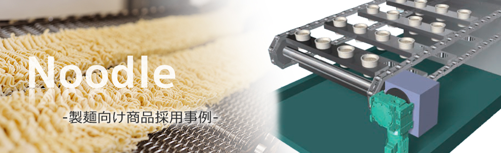 冷却された麺をカップに投入する工程では、ひとつずつ正確に投入するため、つばきのニードルブシュチェーンが使用されています。また、製品の近くに給油できない環境で機長も長いため、無給油かつ長寿命のX-ラムダも仕様されています。