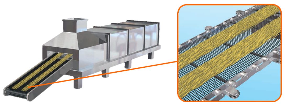 フライ麺では蒸し上がった麺を1食ずつに切り、型に入れて油で揚げます。ここでもバイピッチチェーンや、装置洗浄時の蓋の開閉用にリニパワージャッキやカップリング、マイタギヤボックスを活用したジャッキシステムが活躍しています。ノンフライ麺の場合は油で揚げず、高温の熱風をかけて乾燥させます。