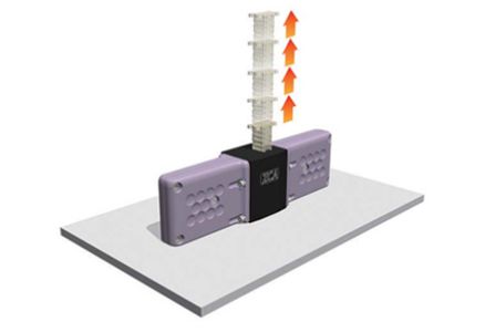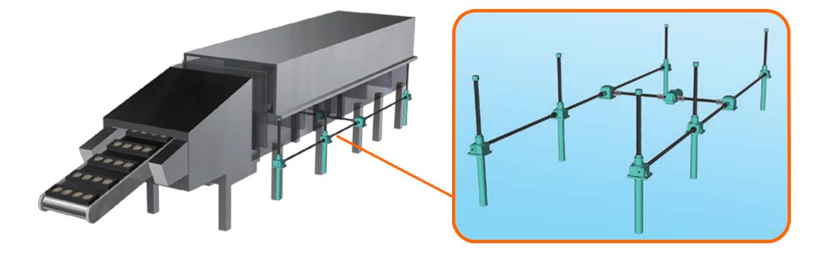複数台のジャッキを昇降部の大きさや荷重状態に適した配置で連動運動することにより、機械的に同期がとれ性格で安定した昇降装置を実現できます。つばきではリニパワージャッキだけでなく、ギヤボックス・カップリング・駆動部を含めたジャッキシステム一式を選定します。※見積図面・レイアウト図も作成します