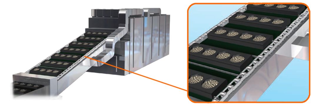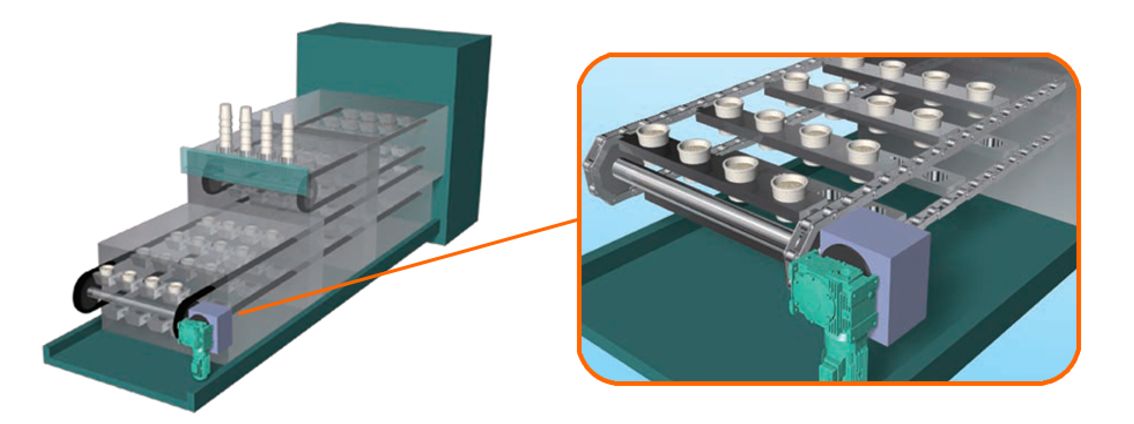 高温対策および洗浄の際の腐食の対策に、無給油で使用可能なラムダチェーンが活躍しています。