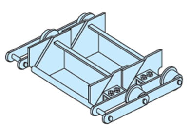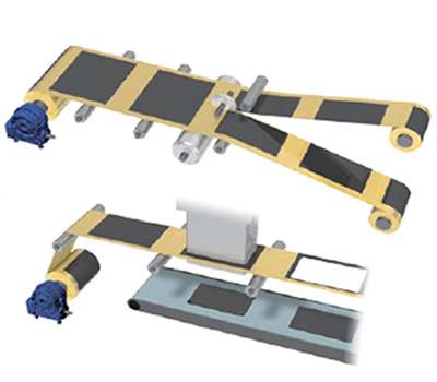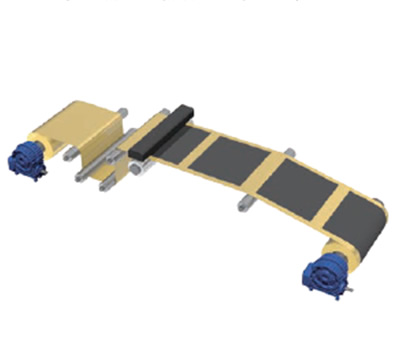 一種容器式輸送機,採用帶鋼繩的橡膠塊鏈和結構獨特的鏟鬥。存儲區的前端和後端通過柔性帶子連接到下一個存儲區,因此連接之間沒有間隙。
