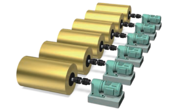 在單一馬達驅動多個輥筒的佈局中,可以選擇蝸輪減速機、MD齒輪箱、膜片聯軸器和時規皮帶等組件,並將其整合在一個封裝中,以匹配設計。