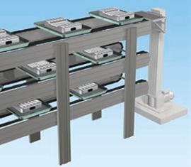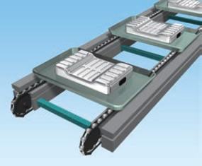 托盤搬運較多的角型、層壓型電池的工序間搬運多採用可累加的自由流動鏈。