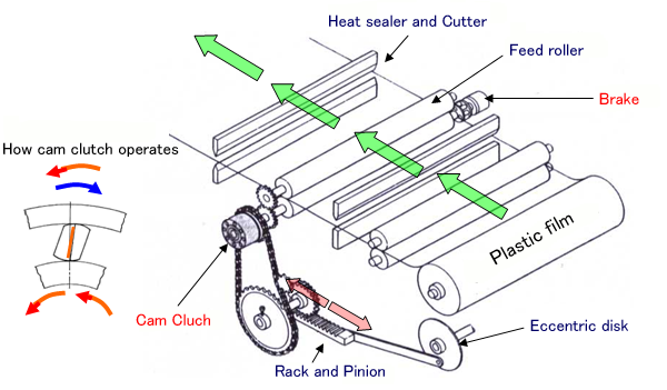 内輪沿著一個方向間歇性地送入,當塑膠薄膜間歇性地送入時,就會進行熱封。