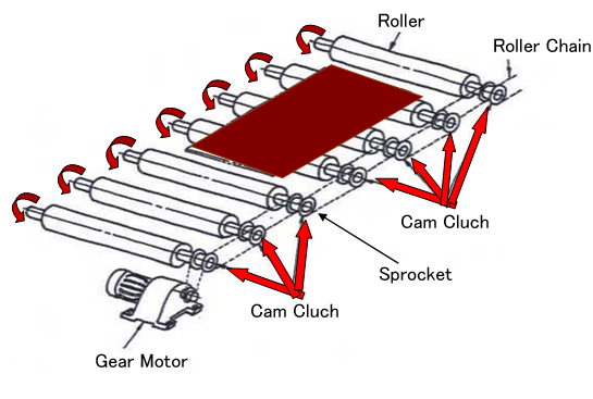 鏈輪連接到凸輪離合器上,並組裝到每個滾輪上。凸輪離合器嚙合時,滾子旋轉。