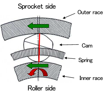 ((右圖:紅色箭頭))空轉是指即使外輪停止轉動,也只有内輪可以沿著紅色箭頭的方向旋轉。