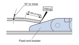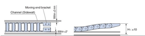 為確保電纜保護鏈條平穩過渡,H型導軌過渡段應傾斜。傾斜角度應為10°以上,長度應為30mm以上,且導軌端部應安裝成與固定端金具接觸。