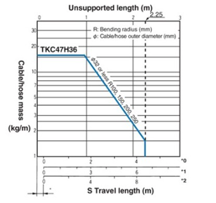 能力曲線圖上的移動行程S 適用於電纜保護鏈條的固定端安裝在移動行程中心的情況。