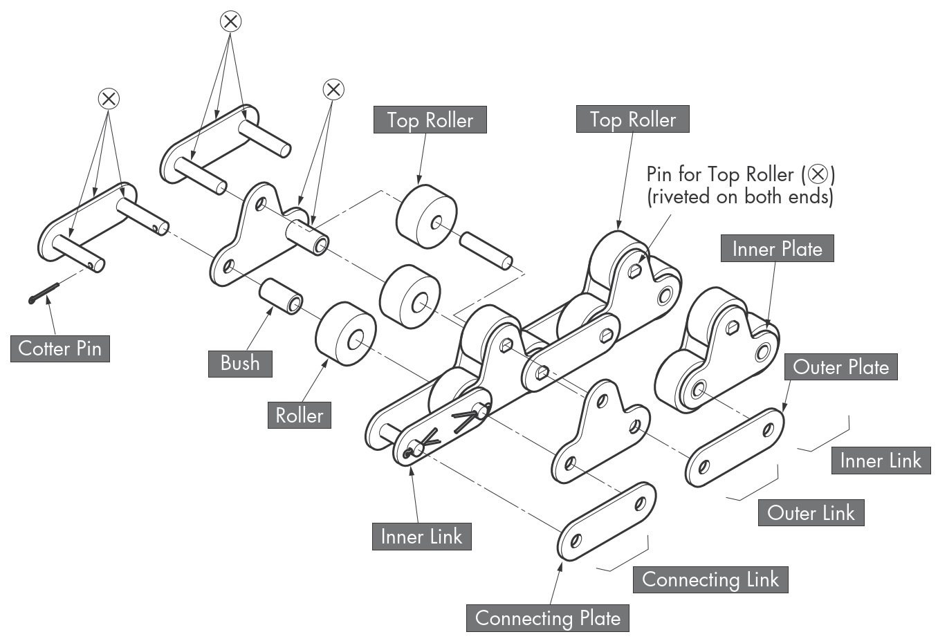 - ·滾子以外的鏈條主體材質全部為鋼制的熱處理硬化品。