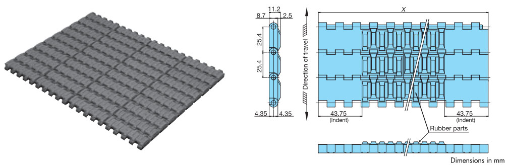 7.ラバータイプのプラスチックモジュラーチェーンにはインデント(ラバーが無い部分)が必要です。