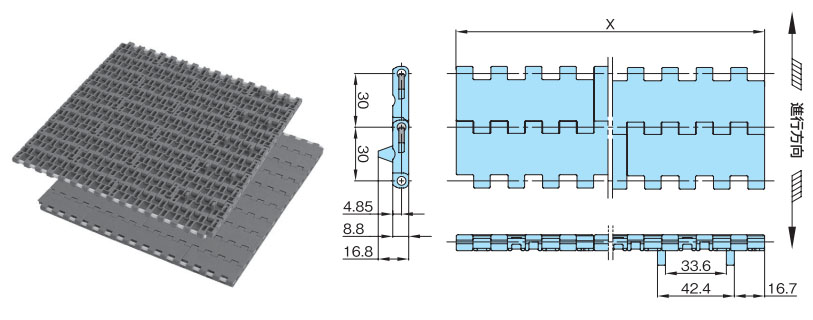 • ・幅広と幅狭のプラスチック製モジュールをレンガ状に組合せ、ワイドな搬送面を実現し大量搬送が可能です。