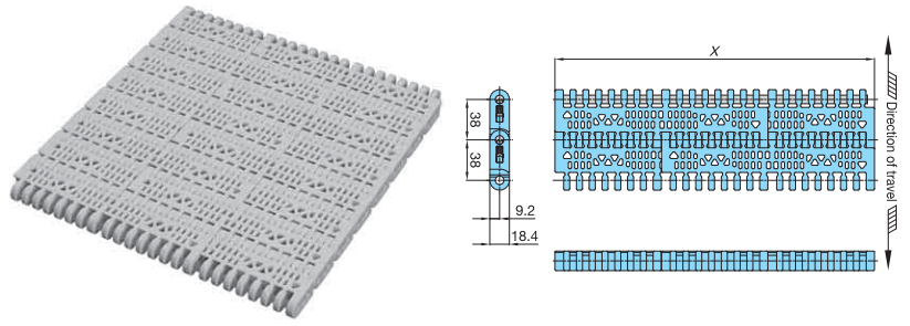 • ・幅広と幅狭のプラスチック製モジュールをレンガ状に組合せ、ワイドな搬送面を実現し大量搬送が可能です。