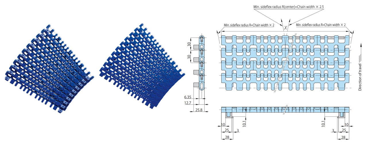 • ・塑膠模組鏈條可實現各種彎曲佈局下的運輸,例如90度、180度和S形曲線。