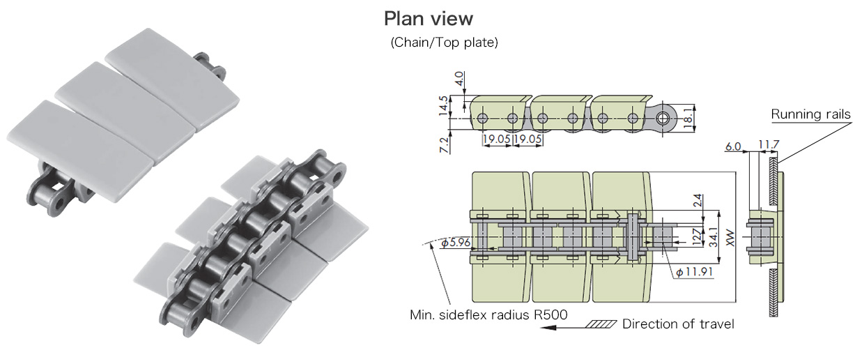 • - 一種具有較大容許張力(TTUP容許張力的兩倍)的弧形輸送鏈。 TN型弧形鏈。