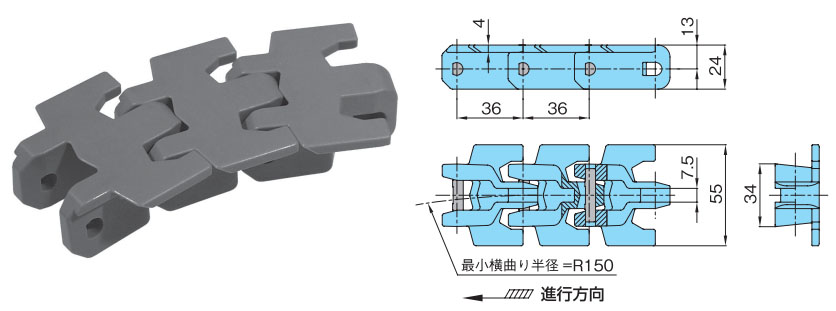 • ・小さな横曲がり半径(R=150)。自由なレイアウトが可能で、狭いスペースでの搬送に最適です。