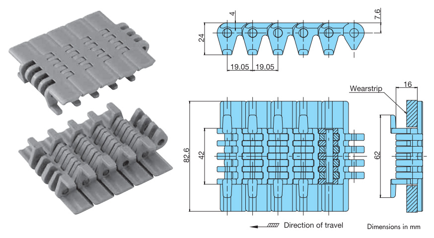 • - 附防上附件鏈條。防止在轉角處以及上升和下降輸送機上發生上提,並防止回程側板的上表面受損。