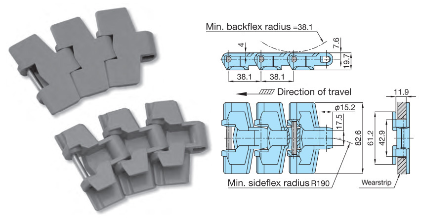 • ・浮上り防止アタッチメント付チェーン。コーナ部での浮上りやリターン側での上面のきずつきを防止します。