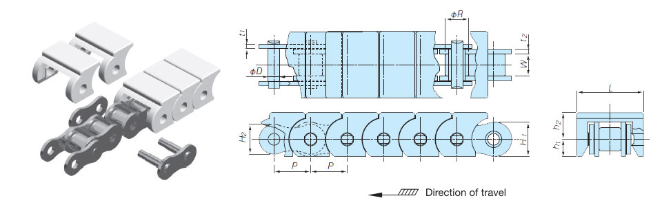 • - 比塑膠塊狀鏈條具有更高的容許張力(RS60-SC 的允許張力約為 RSP60 的 7 倍)。非常適合長距離運輸的場景。