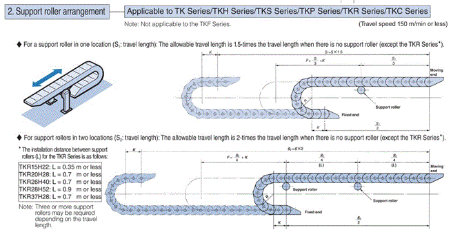 支承輥 (R) 如果需要行程為(自由跨距)-(預留長度)的兩倍或以上,或移動行程超過最大移動行程,則安裝支撐滾輪(或板)來支撐電纜保護鏈條。